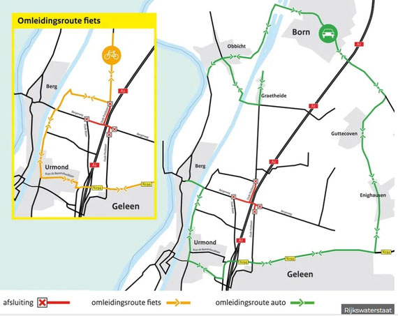 Fietsers worden omgeleid via de Molenweg Zuid, Ruys de Beerendoucklaan, Rooseveltstraat, Nieuwe Postbaan, Urmonderbaan (N294) en automobilisten rijden via de Molenweg Zuid, Mauritslaan, Nieuwe Postbaan, Urmonderbaan (N294).