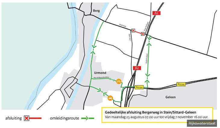 Het fietspad en de rijbaan van de Bergerweg ten westen van de A2 zijn afgesloten in beide richtingen van maandag 25 augustus 07.00 uur tot vrijdag 7 november 16.00 uur. Hierdoor kan er geen verkeer vanuit Berg aan de Maas richting Graetheide rijden en andersom.